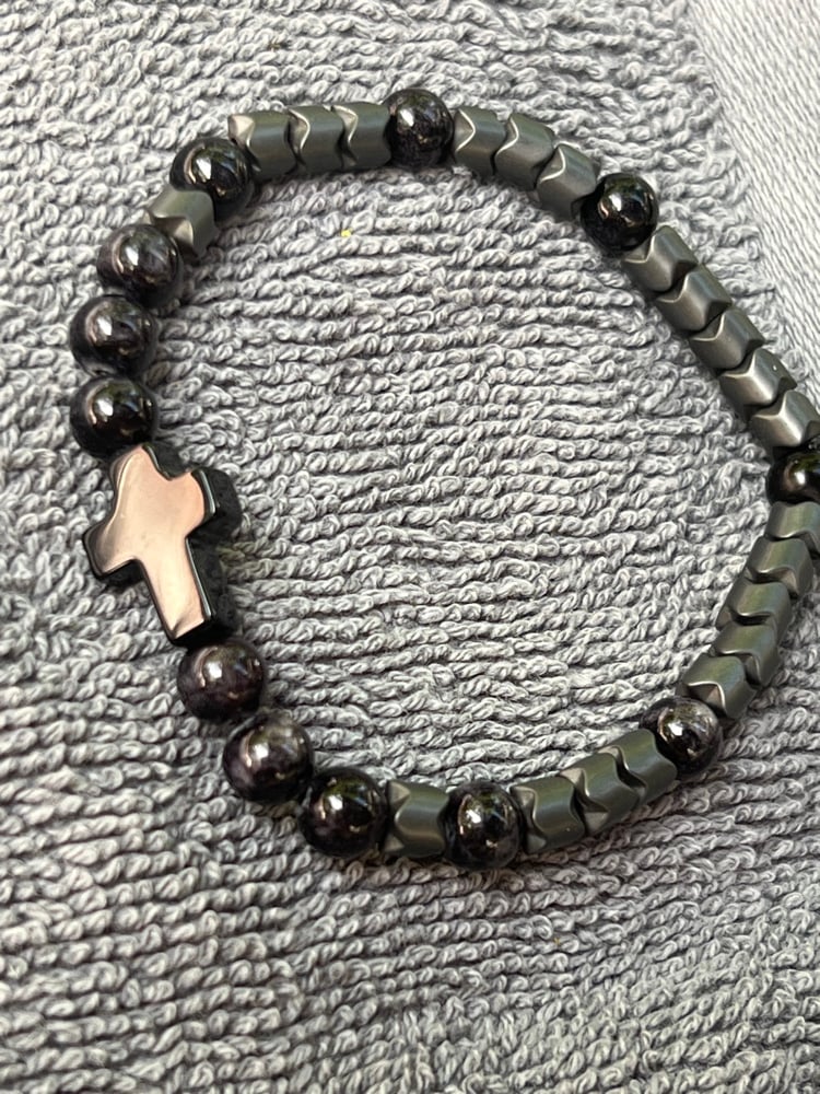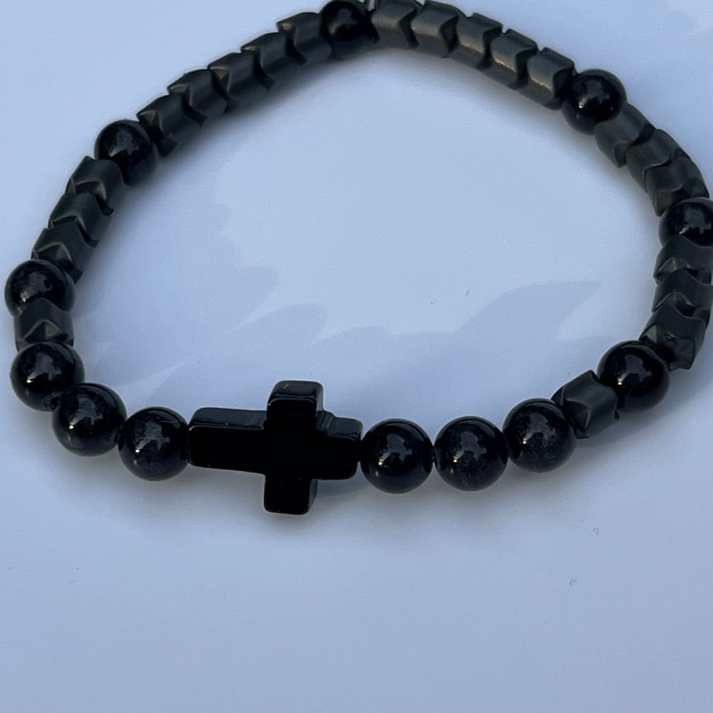 Réalisé à la main dans mon atelier, ce bracelet associe Agate noire, Hématite et croix centrale dans les mêmes tons profonds.