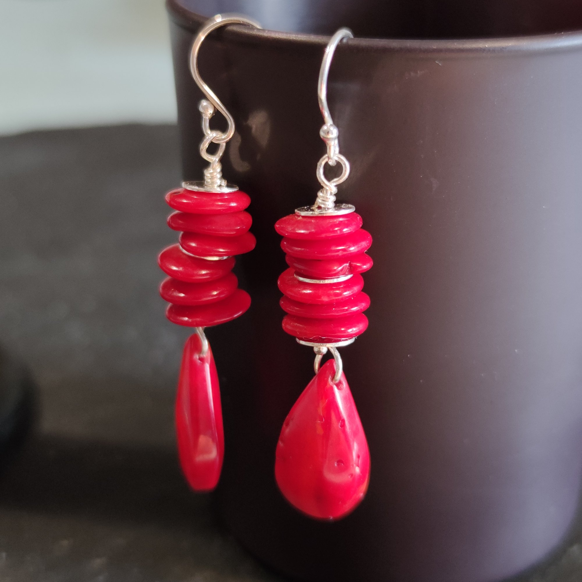 CORALSILVER Disques Corail argent/ Goutte facettée corail Monture argent