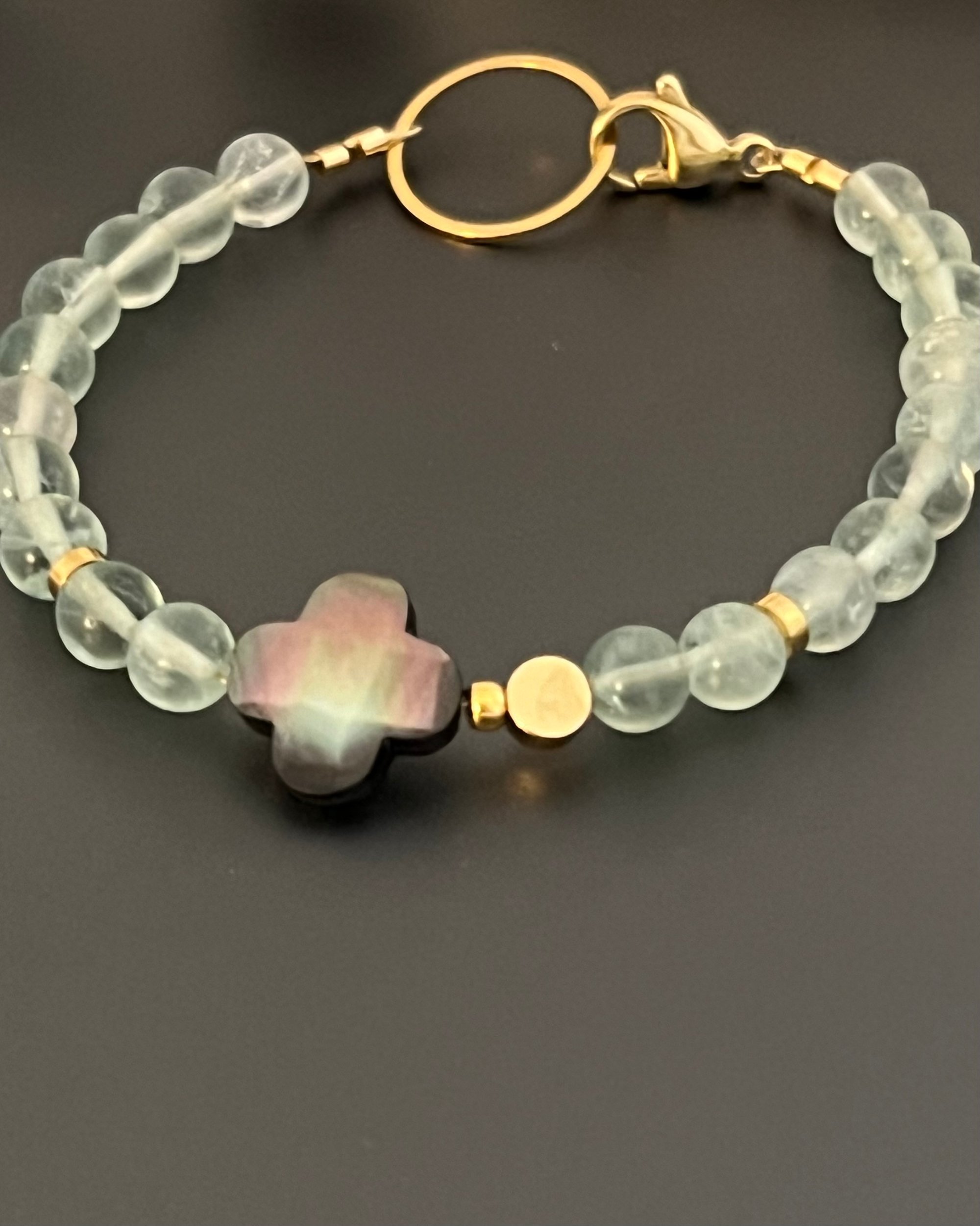 Bracelet Original & Unique créé dans l.atelier parisien d’Emie Lalune, en perles Fluorite ø6mm, Trèfle en nacre, Fermoir acier doré à l’or fin 24k