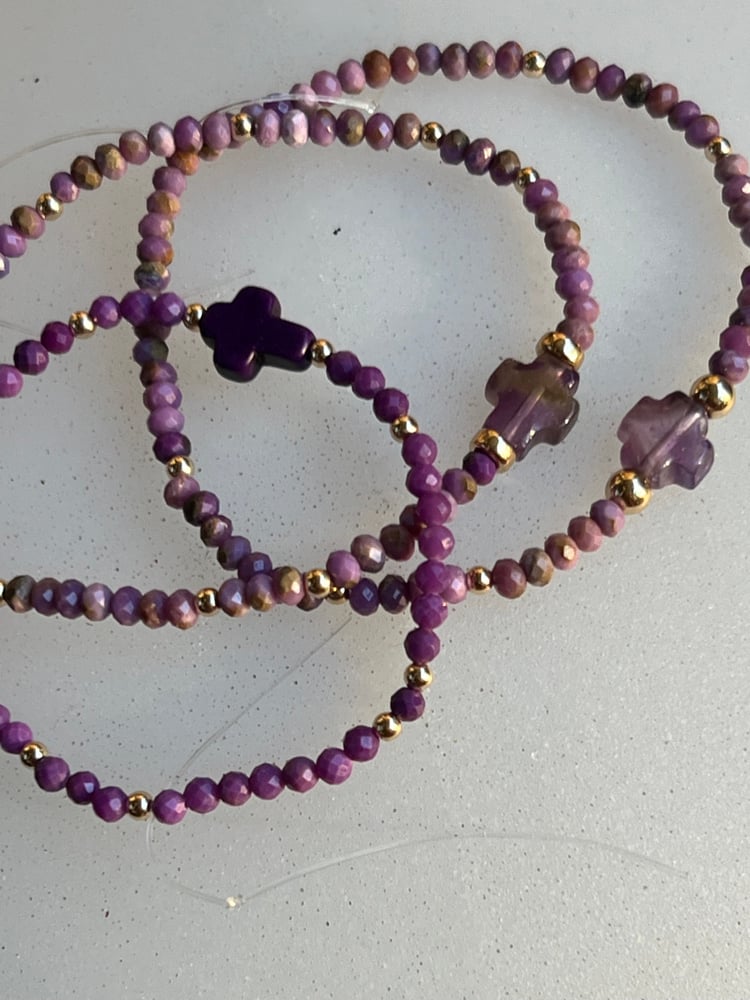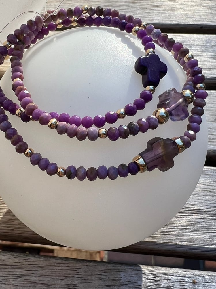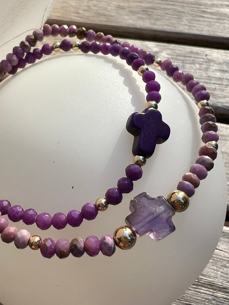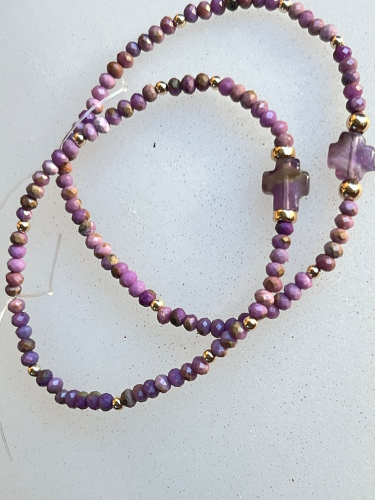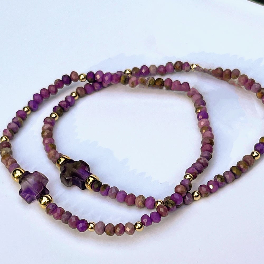 Composé de Phosphosidérite, pierre rare aux nuances violines, et de perles en gold filled 14k, il allie élégance et spiritualité.