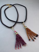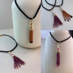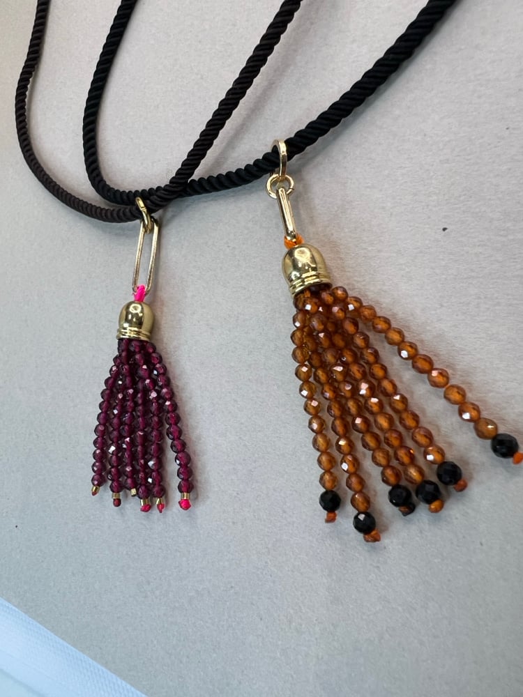 Pendentifs en pompons de Grenats grade A, aux nuances profondes de prune et éclats chaleureux d’orange, qui allient beauté et énergie.